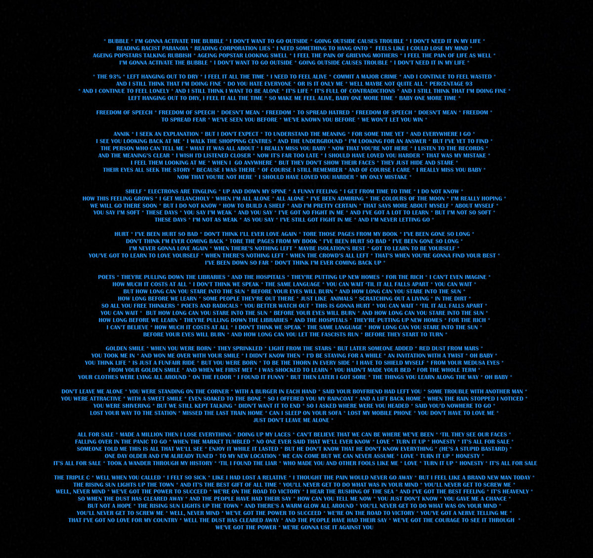 THAT I’VE GOT NO LOVE FOR MY COUNTRY * WELL THE DUST HAS CLEARED AWAY * AND THE PEOPLE HAVE HAD THEIR SAY * WE’VE GOT THE COURAGE TO SEE IT THROUGH *